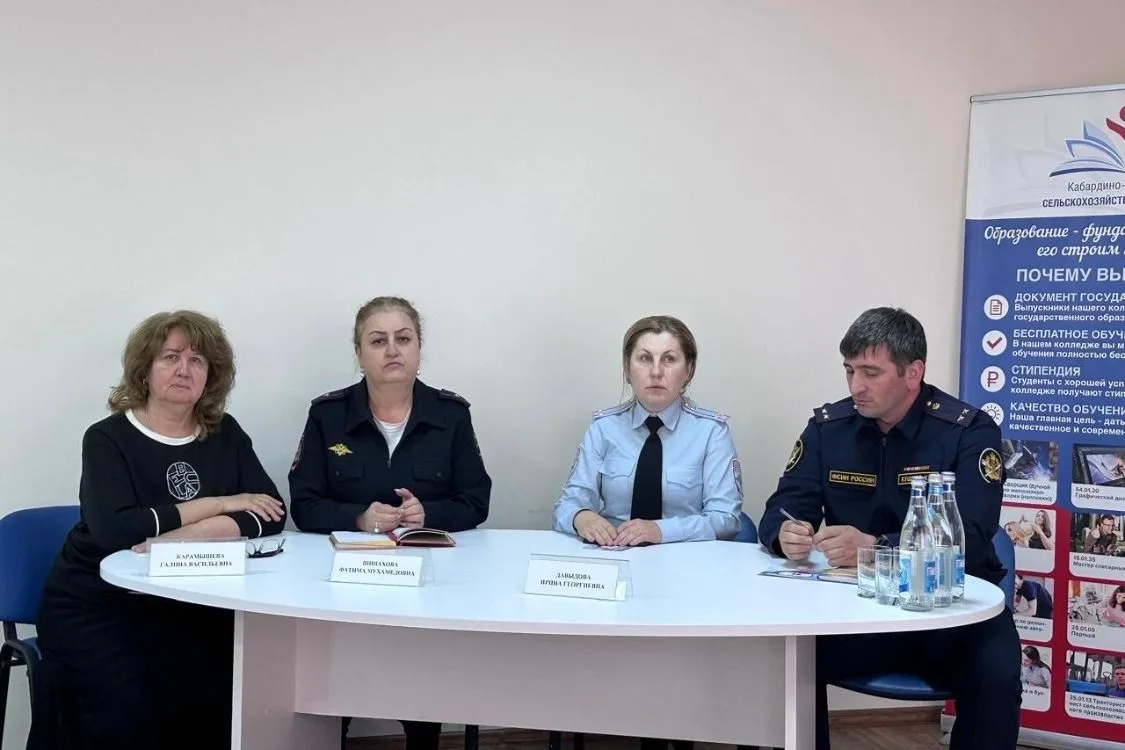 Участие в нем приняли начальник отделения муниципальной комиссии по делам несовершеннолетних и защите их прав местной администрации г.о. Баксан Галина Карамышева, начальник Баксанского межмуниципального филиала Уголовно-исполнительной инспекции УФСИН России по КБР майор юстиции Хасан Кушхов, заместитель директора Карина Балкарова, социальный педагог Замира Жангериева, а также кураторы учебных групп Кабардино-Балкарского сельскохозяйственного колледжа.