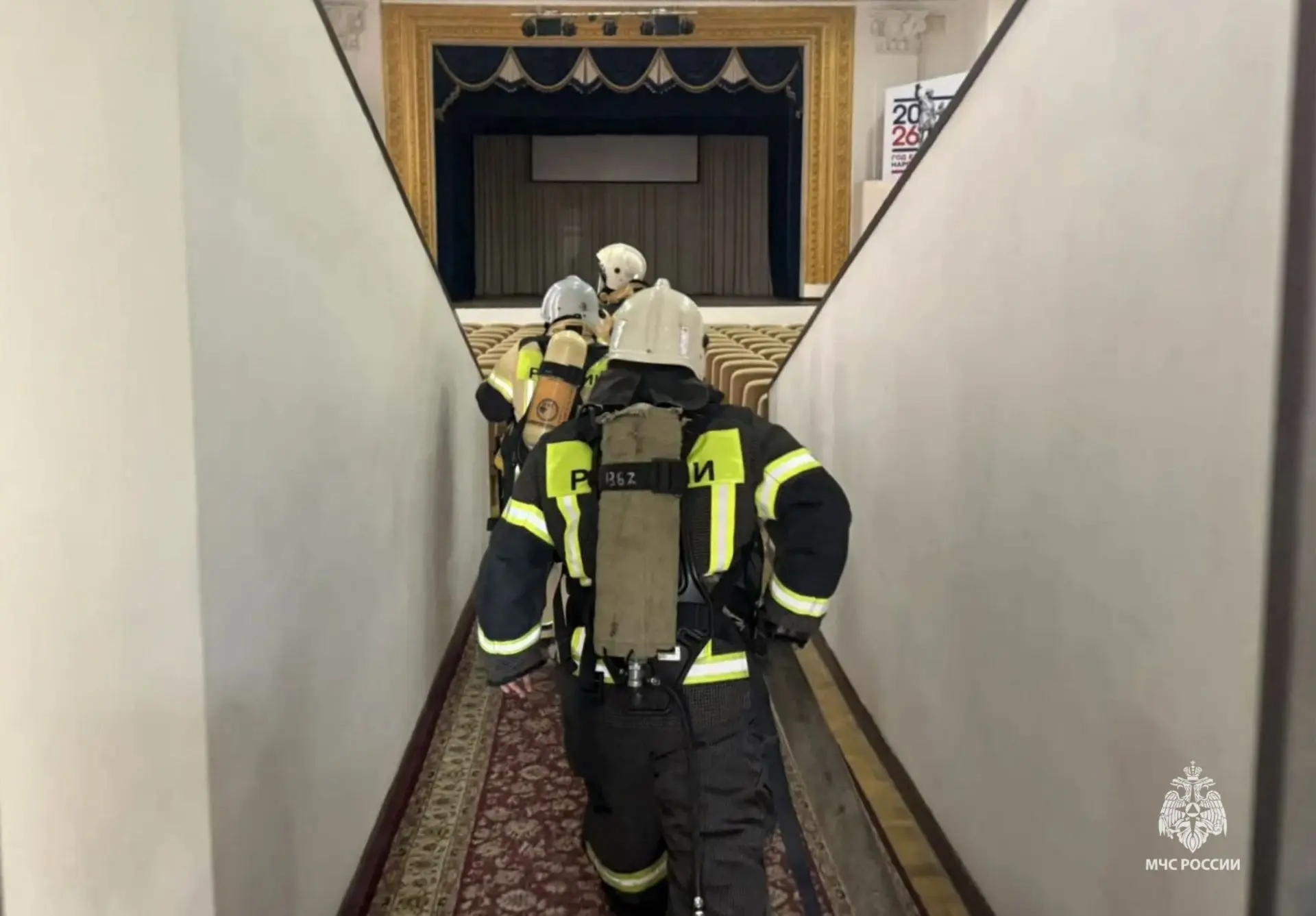 Согласно тактическому замыслу, пожар возник в зрительном зале. Площадь пожара составила 150 квадратов. Возникает угроза распространения огня на соседние помещения и вышестоящие этажи.