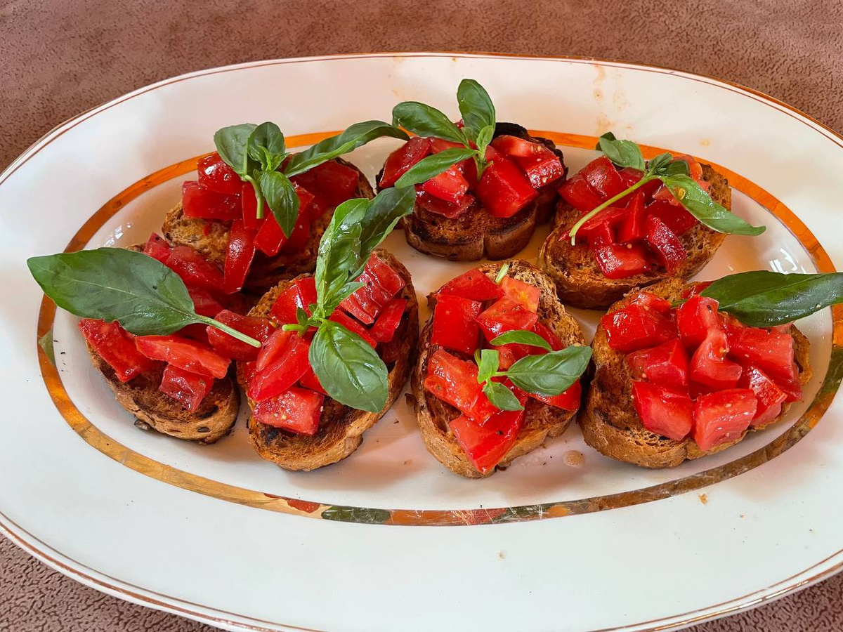 Дайте постоять 5 минут, чтобы хлеб пропитался оливковым маслом и соком помидоров, и ваши брускетты готовы!