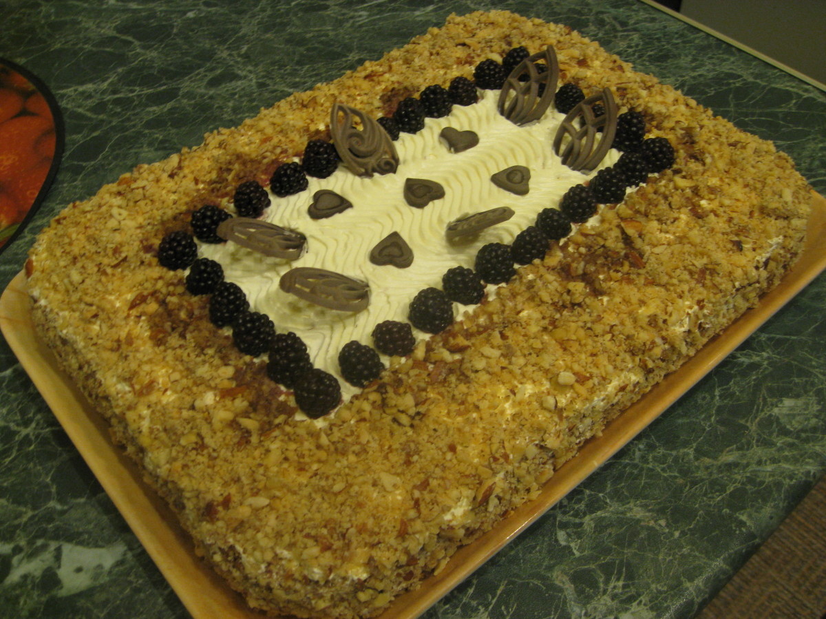 Обмазать торт остатков кремом и украсить дроблеными орехами, свежей ежевикой и любым декором, который поднимет праздничное настроение. Обязательно дайте торту замариноваться в течение минимум 8 часов, чтобы раскрыть все его вкусы.