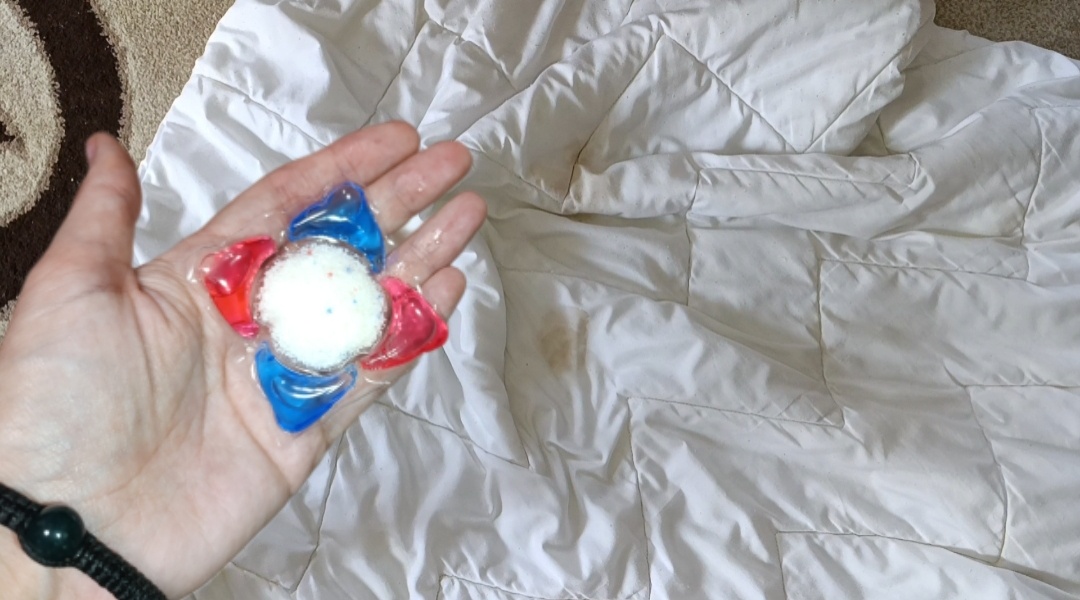 Для изделий из шерсти, пуха или ваты важно соблюдать осторожность, чтобы не повредить наполнитель. Также, если есть пятна, можно использовать пятновыводители или сделать кашицу из моющего средства и соды, нанеся её на загрязнённый участк перед замачиванием.