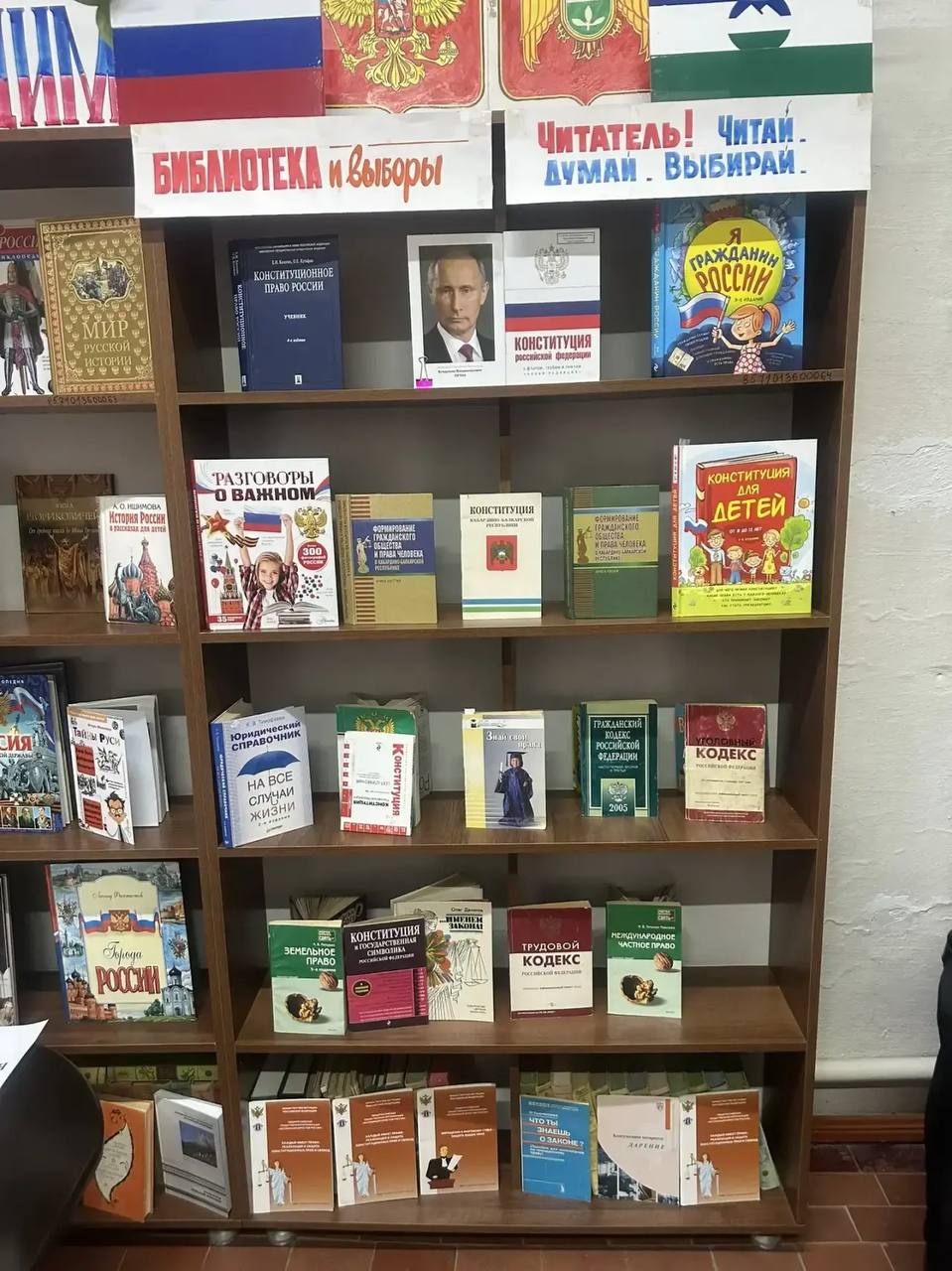Также сотрудники библиотеки подготовили книжную выставку «Читай, думай, выбирай», в которой представлена полезная информация об избирательном праве, порядке проведения избирательной кампании, правилах голосования. Знакомство с литературой, представленной на выставке, способствует повышению уровня информированности молодых избирателей о выборах и их гражданско-правовой культуры.