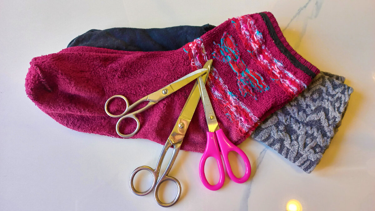 Для создания понадобится полотенце размером 60х40 см и 4 пары носков. Мысок носка срезается, а остальная часть нарезается на полоски шириной 1 см. Пятки также можно удалить, если они сильно изношены, но по желанию их можно оставить.