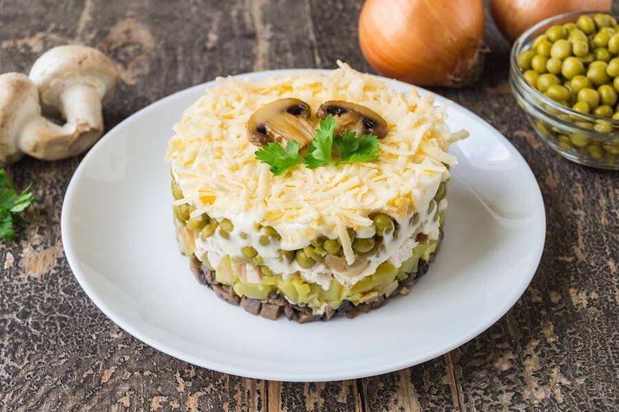 При желании, украсить салат листьями зелени, грибами и горошком. Для достижения наилучшего вкуса, оставить в холодильнике на 1-1.5 часа, чтобы все слои пропитались.