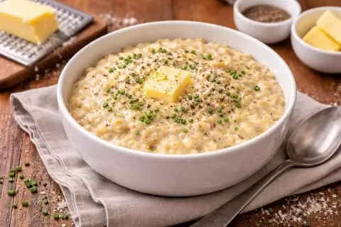 Это блюдо напомнит вам ризотто, но с характерным овсяным акцентом. Чтобы достичь идеального вкуса, лучше выбирать твердые сорта сыра — например, пармезан или чеддер.