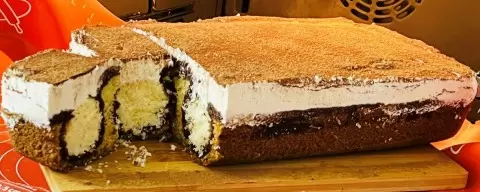 После этого пирог ставят в духовку, а тем временем приготовьте воздушный крем. Остуженный пирог нужно обильно смазать кремом и немного присыпать какао для украшения. Такой десерт мгновенно исчезает со стола, оставляя после себя только восхищенные отзывы гостей.