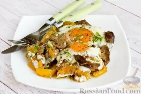 - Яичница с куриной печенью и болгарским перцем: Печень — отличный выбор для сытного завтрака. Особенно куриная, благодаря своей нежности. Приготавливая её с перцем, можно создать полноценное блюдо, которое подойдет не только на завтрак, но и на обед.