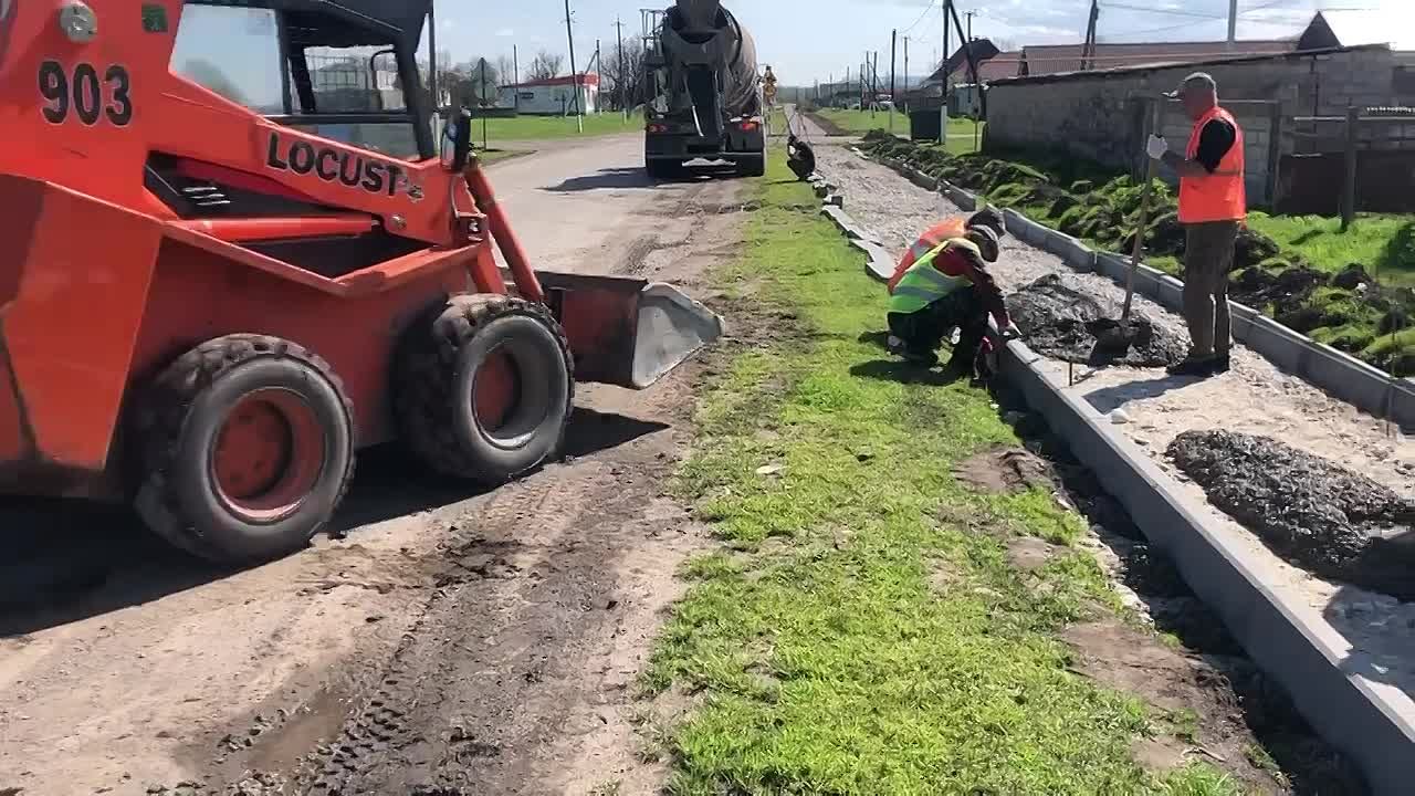Дорожниками продолжаются работы по устройству основания и бортовых камней на тротуарах, завозится инертный материал для дальнейших работ.