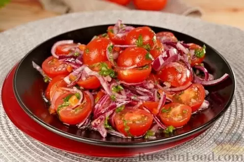- Маринованный салат из помидоров – сочные томаты, замаринованные с добавлением ароматных специй, отлично подойдут к мясным блюдам и станут настоящим украшением стола.