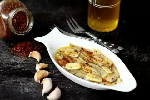 Теперь пришло время для чеснока: нарезать его тонкими пластинками. Слить маринад с рыбы и на дно подходящей миски налить немного оливкового масла. Выложить первый слой мойвы, затем уложите сверху пластинки чеснока, посыпьте паприкой и добавьте ещё немного масла. Чтобы добавить остроты, можно также использовать острый перец. Продолжайте укладывать слои, пока не закончится мойва. В итоге у вас должна получиться яркая композиция вкусов.