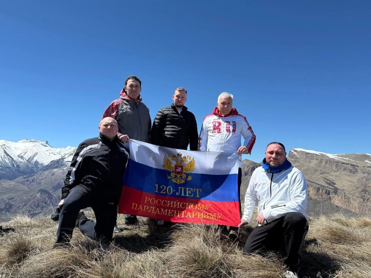 На одной из вершин Скалистого хребта в Чегемском ущелье законодатели развернули флаг с надписью "120 лет российскому парламентаризму". Своё восхождение законодатели приурочили к юбилейной дате со дня учреждения отечественного парламента.