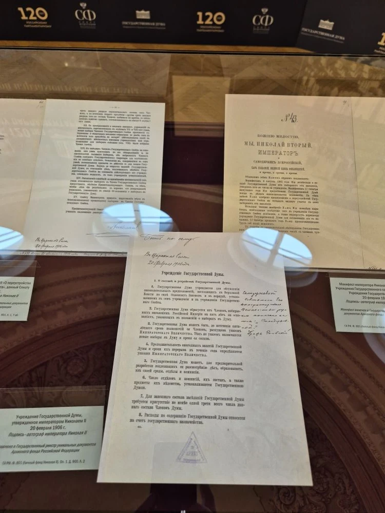 В этот же день в рамках проведения Совета законодателей РФ открыта историко-документальная выставка "История российского парламентаризма в документах Российского государственного исторического архива. К 120-летию учреждения Государственной Думы в России".